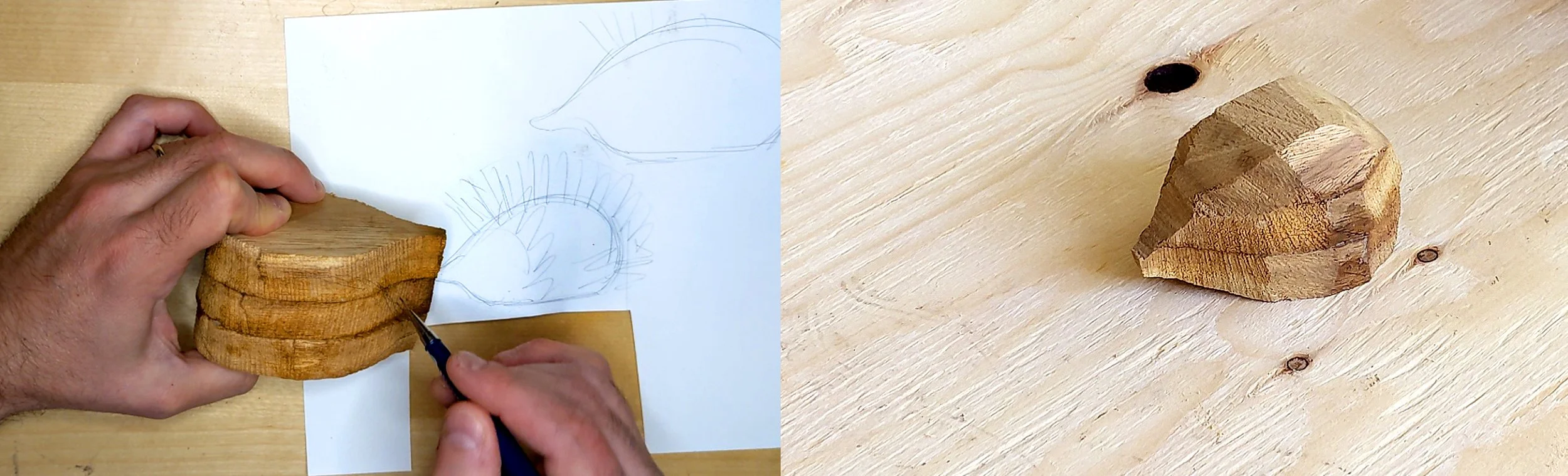 The body would be planks of wood laminated, cut and sanded to shape, and the nails would be the quills. The idea was for an easy, small project that could be done within an hour or two of active work, for which I wanted a stylized look, for a small, cute sculpture.